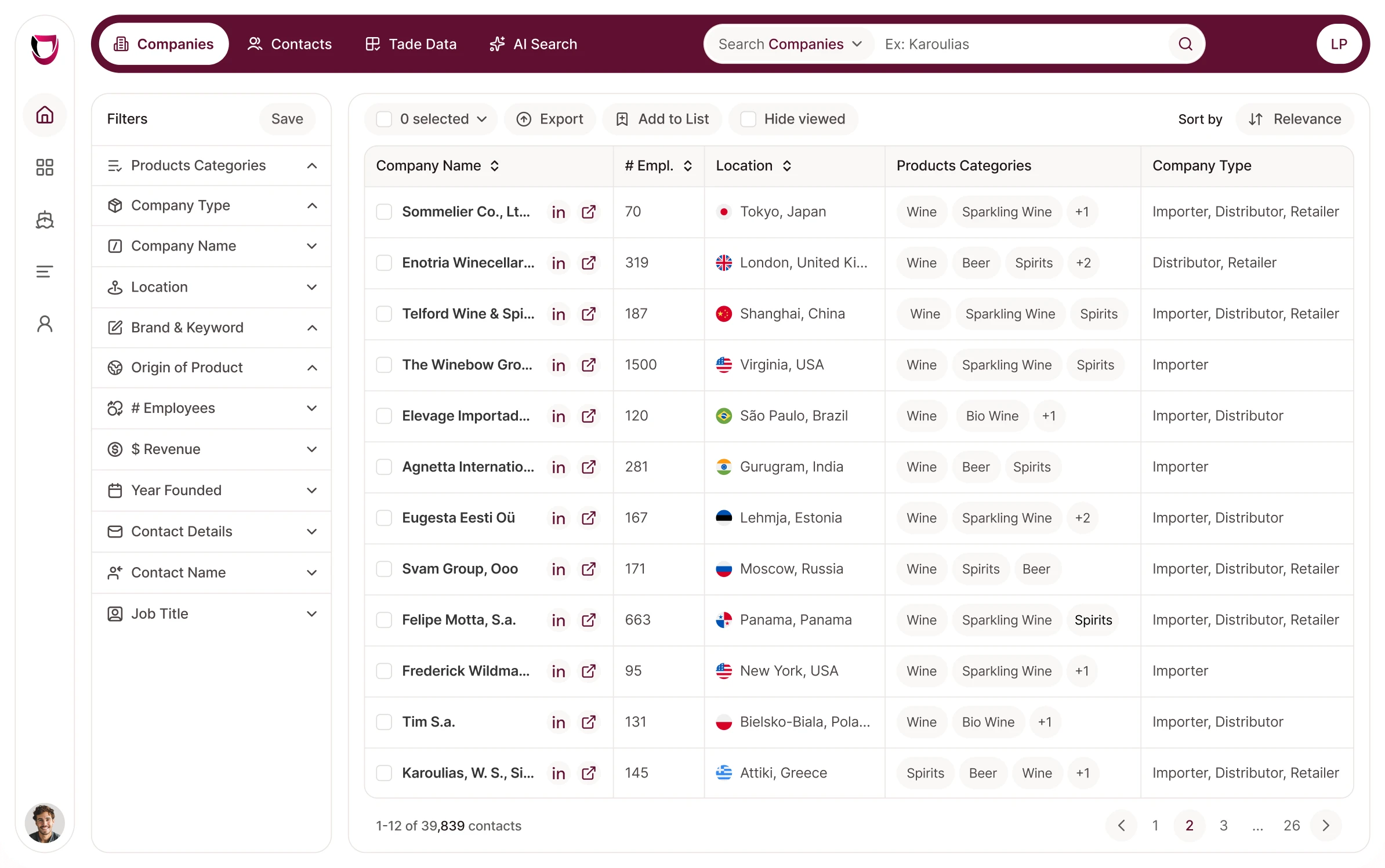 You can find wine importers by using the BestWineImporters database, with a new AI-powered search. The platform allows you to filter companies by country, region, product category, grape variety, denomination, brand, company size, and available buyer contact. Instead of searching manually for wine importers online, you can build a targeted wine importers list in minutes.