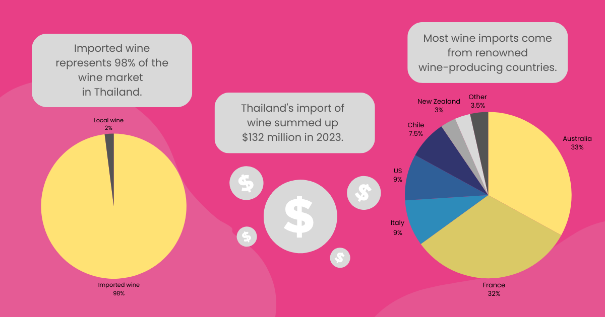 In 2023, Thailand’s imports of wine summed up $132 million, with a five-year average annual growth of around 8%. Imported wine represents 98% of the wine market in Thailand. So, it wouldn’t be a stretch to say that the best wine in Thailand is imported wine.
