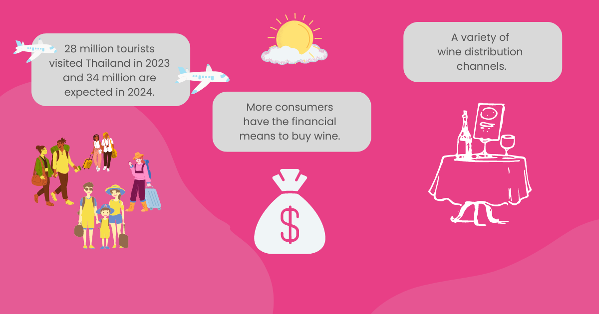 In Thai culture, wine is perceived as a sophisticated drink and is associated with social status. And as the new generation climbs the social ladder and the middle class expands, more consumers have the financial means to afford higher-priced drinks like wine.