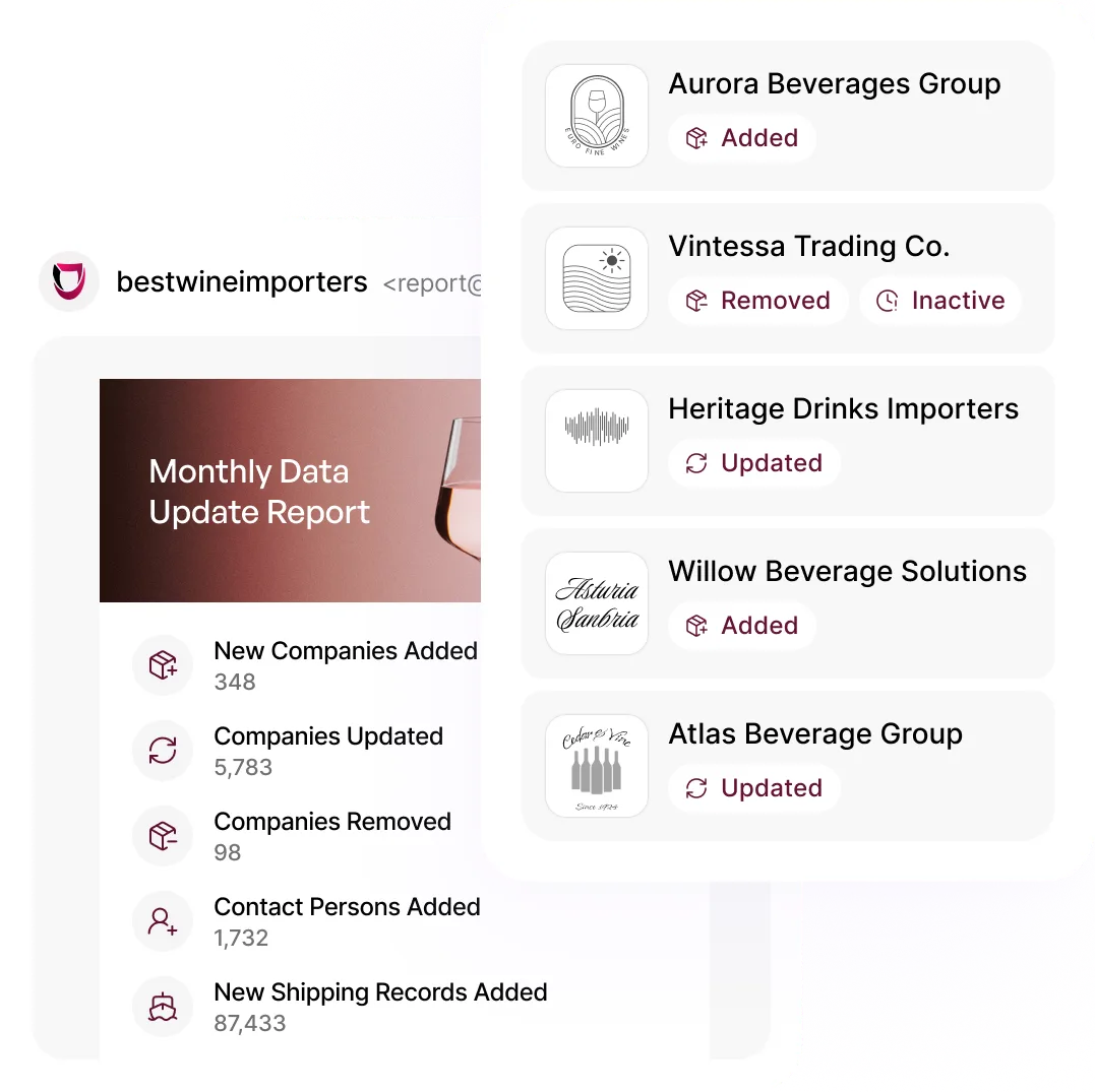 Your subscription is always up-to-date. Every month, hundreds of new spirits importer and distributor contacts are added to the database, while existing profiles are continuously refreshed and verified. This ensures you always work with accurate, up-to-date data, no stale emails, no wasted outreach and helps you discover new spirits market opportunities before your competitors.